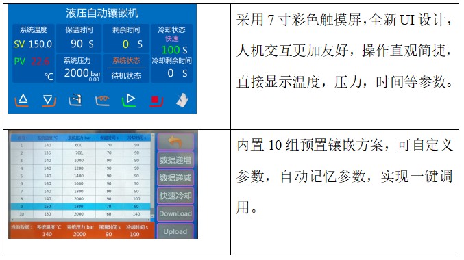 产品介绍 一、产品介绍: ZXQ-2Y型自动镶嵌机是一款先进的液压水冷式自动试样镶嵌设备,独特冷热分离设计,将样品镶嵌时间缩短到6分钟以内,大大提高了工作效率,镶嵌过程由全自动程序进行控制,实现了加热、加压、保压、冷却、卸压等镶嵌过程的一键式操作,无需操作人员值守,自动完成试样镶嵌。该机采用液压泵加压,压力更大,压力范围可调,镶嵌样品表面光亮如镜,制样成功率高。高清触摸屏显示及控制,实时显示压力和温度,镶嵌方案可保存,调取方便;配备强制水冷却系统,制样速度快,采用独特设计的旋转锁上盖,安全性更高,操作更方便,性能稳定,是试样镶嵌的理想设备。 二、主要参数