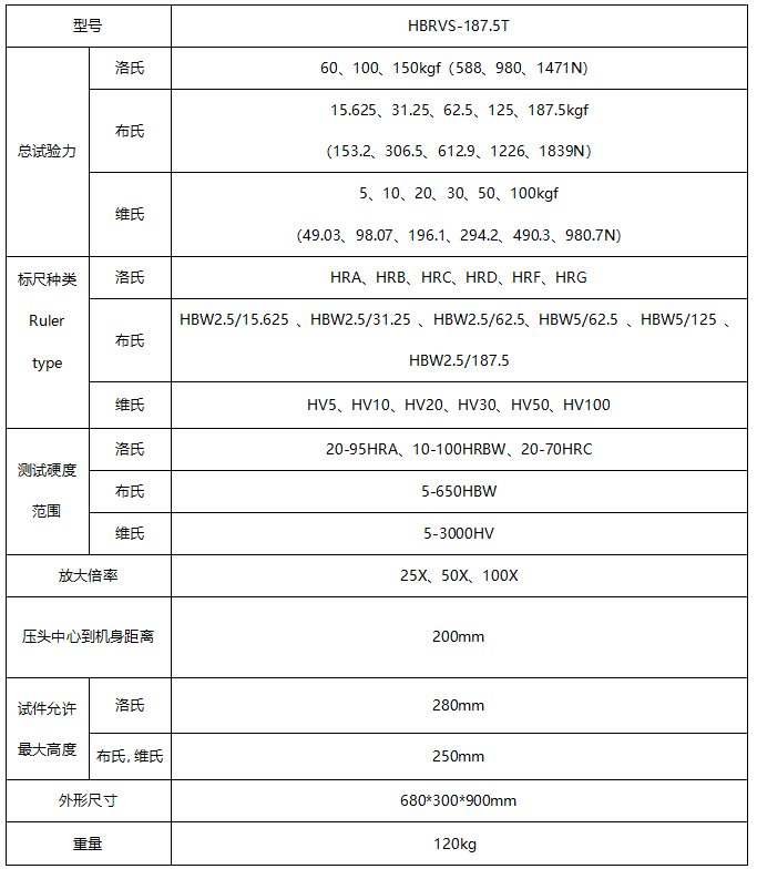 产品介绍 摘要: HBRVS-187.5T数显布洛维硬度计外形新颖、功能齐全、操作方便、显示清晰直观、性能稳定,是集光,机,电于一体的高新技术产品,可进行布氏、洛氏、维氏三种硬度测试,具备多级试验力,能满足多种硬度测试需求。具有较高的测试精度,操作简单、灵敏度高、使用方便,示值稳定等特点。配备内置打印机,并可以选配RS232数据线通过超级终端方式与电脑连接,导出测量报表。 1、采用8寸触摸屏和高速ARM处理器,显示直观,人机互动友好,操作简便; 2、机身使用优质铸铁一次浇铸成型,配合以汽车烤漆处理工艺,外形圆润美观; 3、测量装置采用光栅位移传感器,通过液晶屏显示结果,并可显示与设置测试标尺、试验力、压头类型、保荷时间、换算单位等; 4、具备了布氏、洛氏、维氏三种试验方法,多级试验力,能满足多种硬度测试要求; 5、电子闭环控制施加试验力,完全实现了试验力的自动加荷、保荷、卸荷的自动化运作; 6、高清测量和观察物镜组合,结合内置长度编码器的高清测微目镜,实现了压痕对角线的一键测量,较好地减少了人为操作干扰与读数误差; 7、内置测试软件可对机器硬度值进行修正; 8、便捷控制系统,可自动进行全硬度标尺的单位转换; 9、内置打印机,并可通过RS232、USB接口(可选配)端口输出数据。 应用范围: 1、测定黑色金属、有色金属及硬质合金的布氏、维氏、洛氏硬度; 2、铸件、退火钢、正火钢、有色金属及软合金的布氏硬度; 3、淬火、调质等热处理材料的洛氏硬度; 4、渗氮层、陶瓷、薄板、金属薄片、电镀层、微小零件的维氏硬度。 技术参数: