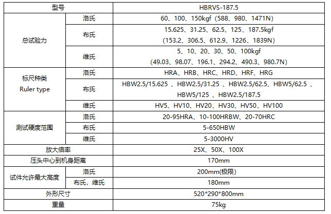 产品介绍 1、采用8寸触摸屏和高速ARM处理器,显示直观,人机互动友好,操作简便; 2、机身使用优质铸铁一次浇铸成型,配合以汽车烤漆处理工艺,外形圆润美观; 3、测量装置采用光栅位移传感器,通过液晶屏显示结果,并可显示与设置测试标尺、试验力、压头类型、保荷时间、换算单位等; 4、具备了布氏、洛氏、维氏三种试验方法,多级试验力,能满足多种硬度测试要求; 5、电子闭环控制施加试验力,完全实现了试验力的自动加荷、保荷、卸荷的自动化运作; 6、高清测量和观察物镜组合,结合内置长度编码器的高清测微目镜,实现了压痕对角线的一键测量,较好地减少了人为操作干扰与读数误差; 7、内置测试软件可对机器硬度值进行修正; 8、便捷控制系统,可自动进行全硬度标尺的单位转换; 9、内置打印机,并可通过RS232、USB接口(可选配)端口输出数据。 应用范围: 1、测定黑色金属、有色金属及硬质合金的布氏、维氏、洛氏硬度; 2、铸件、退火钢、正火钢、有色金属及软合金的布氏硬度; 3、淬火、调质等热处理材料的洛氏硬度; 4、渗氮层、陶瓷、薄板、金属薄片、电镀层、微小零件的维氏硬度。 技术参数: