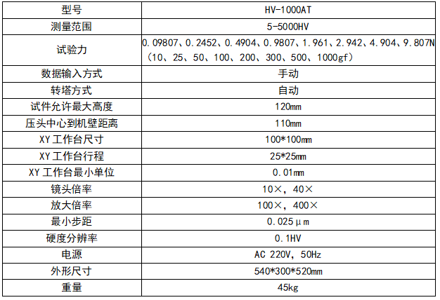 产品介绍 1、机身使用优质铸铁一次浇铸成型,配合以汽车烤漆处理工艺,外形圆润美观; 2、涡轮蜗杆升降系统较好地提高测试稳定性以及测试精度,测试完成后无需再次对焦; 3、便捷数控系统,可自动进行全硬度标尺的单位转换; 4、可设置硬度值的最大值和最小值,当测试值超过设定范围时,发出蜂鸣音; 5、具有软件硬度值修正功能,可以在一定范围内直接对硬度值进行修正; 6、具有数据库功能,对试验数据自动进行分组保存,每组可保存10个数据,可以保存2000个以上数据; 7、具有硬度值曲线显示功能,直观显示硬度值的变化; 8、可选配CCD图像处理系统,另可选配努氏压头,进行努氏硬度测量; 9、配置无线蓝牙打印机,并可通过RS232、USB(可选装)接口输出数据; 10、精度符合GB/T4340.2、ISO6507-2 和美国ASTM E384标准。 应用范围: 1、黑色金属、有色金属、IC薄片,表面涂层、层压金属; 2、玻璃、陶瓷、玛瑙、宝石、薄塑料等; 3、碳化层和淬火层的深度及梯度的硬度测试。 4、适用于平行平面和微小零件及超薄零件的精密显微维氏硬度测量。 技术参数:
