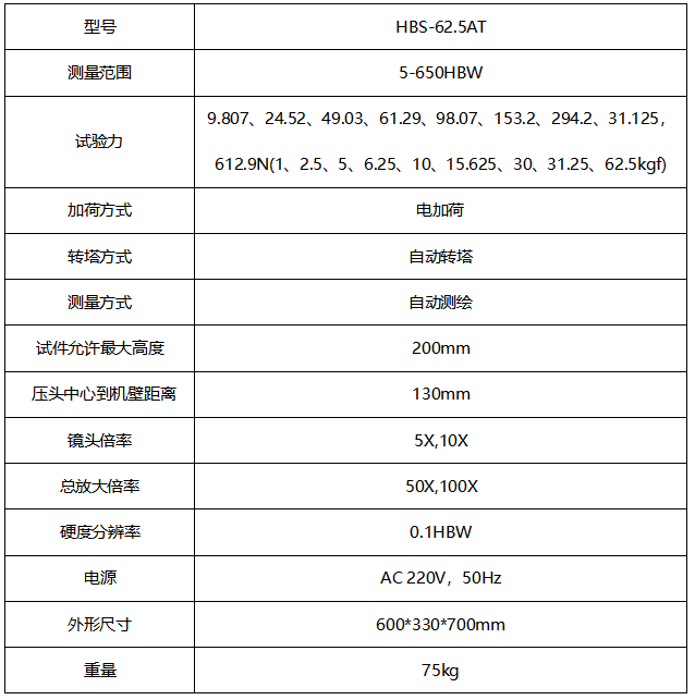 产品介绍 1、机身使用优质铸铁一次浇铸成型,配合以汽车烤漆处理工艺,外形圆润美观; 2、配置自动转塔功能,压头和镜头之间自动切换,使用更加方便; 3、便捷控制系统,可自动进行全硬度标尺的单位转换; 4、电子闭环控制施加试验力,完全实现了试验力的加荷、保荷、卸荷的自动化运行; 5、可设置硬度值的最大值和最小值,当测试值超过设定范围时,发出报警音; 6、具有软件硬度值修正功能,可以在一定范围内直接对硬度值进行修正; 7、具有数据库功能,对试验数据自动进行分组保存,每组可保存10个数据,可以保存2000个以上数据; 8、具有硬度值曲线显示功能,直观显示硬度值的变化; 9、配置无线蓝牙打印机,并可通过RS232、USB(可选装)接口输出数据; 10、可选配CCD图像处理系统或视频测量装置; 11、精度符合GB/T231.2、ISO6506-2和美国ASTM E10标准。 应用范围 1、测定黑色金属,有色金属及轴承合金材料的布氏硬度; 2、应用范围广,尤其适用于软金属材料及小型零部件的布氏硬度试验。 技术参数