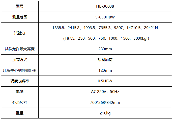 产品介绍 1、产品机身部分由浇铸工艺一次成型,并经过了长时间的时效处理。相对于拼板工艺,长期使用形变量小,并可有 效适应各种恶劣的环境; 2、汽车烤漆,漆质档次高,抗划伤能力强,使用多年依然光亮如新; 3、结构坚固、刚性好、准确、可靠、耐用,测试效率高; 4、控制面板强弱电相分离,避免了相互干扰及因电流过大击穿面板,提高了操作的安 全性及面板的使用寿命; 5、大功率固态继电器,功率大、功耗低、无触点、无火花,控制与被控制的隔离度高,使用寿命长; 6、大扭矩永磁同步电机取代了老式的减速器,使机器噪音小,故障率低; 7、精度符合GB/T231.2、ISO6506-2和美国ASTM E10标准。 应用范围 1、测定黑色金属、有色金属及轴承合金材料的布氏硬度; 2、硬质合金、渗碳钢、淬火钢、表面淬火钢、硬铸钢、铝合金、铜合金、可锻铸件、软钢、调质钢、退火钢、轴承钢等。 技术参数