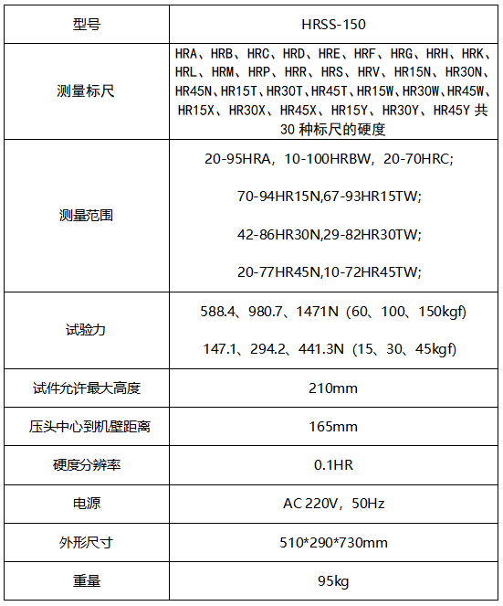 产品介绍 1、机身使用优等铸铁一次浇铸成型,配合以汽车烤漆处理工艺,外形圆润美观; 2、测量装置采用光栅位移传感器,通过液晶屏显示结果,并可显示与设置测试标尺、试验力、压头类型、保荷时间、换算单位等; 3、电子闭环控制施加试验力,完全实现了试验力的自动加荷、保荷、卸荷的自动化运作;、 4、内置测试软件可对机器硬度值进行修正; 5、便捷控制系统,可自动进行全硬度标尺的单位转换; 6、内置打印机,并可通过RS232端口输出数据; 7、精度符合GB/T230.2、ISO6508-2和美国ASTM E18标准。 应用范围 1、广泛用于测定黑色金属,有色金属,非金属材料的洛氏硬度; 2、塑料、复合材料、各种摩擦材料软金属、非金属材料等的硬度。 技术参数