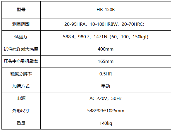 产品介绍 HR-150B加高洛氏硬度计 1、机身使用优等铸铁一次浇铸成型,配合以汽车烤漆处理工艺,外形圆润美观; 2、加高型设计,适合大中型零件; 3、表盘直接读取硬度值,并可选配洛氏的其它标尺,如HRD、HRF等硬度标尺; 4、采用了无摩擦主轴,试验力精度高; 5、采用了一体铸造的精 密液压缓冲器,无缓冲液泄漏,且加卸荷平稳、无冲击、速度可调; 6、精度符合GB/T230.2、ISO6508-2和美国ASTM E18标准。 应用范围 1、广泛用于测定黑色金属,有色金属,非金属材料的洛氏硬度; 2、主要用于淬火和调质等热处理材料的洛氏硬度的测量; 3、硬质合金、渗碳钢、淬火钢、表面淬火钢、硬铸钢、铝合金、铜合金、可锻铸件、软钢、调质钢、退火钢、轴承等材料。 技术参数