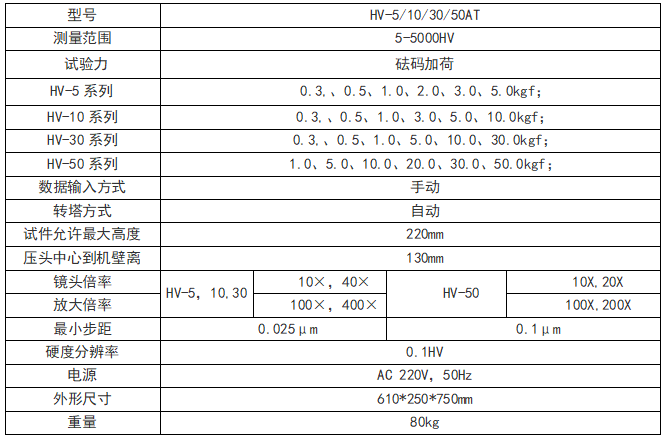 产品介绍 1、机身使用优质铸铁一次浇铸成型,配合以汽车烤漆处理工艺,外形圆润美观; 2、配置了自动转塔功能,高分辨率的测量和观察物镜,消除人为操作干扰与读数误差; 3、便捷操作系统,可自动进行全硬度标尺的单位转换; 4、可设置硬度值的最大值和最小值,当测试值超过设定范围时,发出报警音; 5、具有软件硬度值修正功能,可以在一定范围内直接对硬度值进行修正; 6、具有数据库功能,对试验数据自动进行分组保存,每组可保存10个数据,可以保存2000个以上数据; 7、具有硬度值曲线显示功能,直观显示硬度值的变化; 8、可选配CCD图像处理系统,另可选配努氏压头进行努氏硬度测量; 9、配置无线蓝牙打印机,并可通过RS232、USB接口输出数据; 10、精度符合GB/T4340.2、ISO6507-2 和美国ASTM E92。 应用范围: 1、黑色金属、有色金属、IC薄片,表面涂层、层压金属; 2、玻璃、陶瓷、玛瑙、宝石、薄塑料等; 3、碳化层和淬火层的深度及梯度的硬度测试; 4、适用于平行平面和微小零件及超薄零件的精密维氏测量。 技术参数: